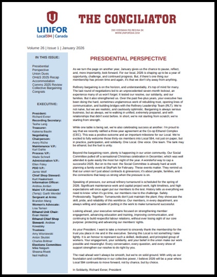 The Conciliator: 2026 January 2026 Conciliator Inside this issue: Presidential PerspectiveUnion DuesOH&S 2025 RecapAccommodationComms 2025 ReviewCollective BargainingCongratsEFAPNew Members